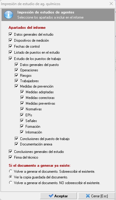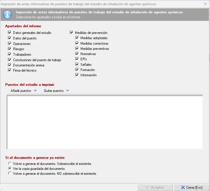 Al enviar a imprimir un acta informativa de una evaluación de riesgos, aparecerá una pequeña ventana donde el usuario deberá seleccionar el puesto para el que quiere imprimir el acta informativa y los apartados del informe que quiere imprimir.
