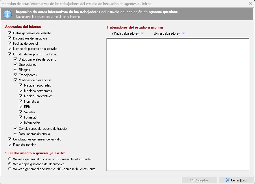 Esta opción es similar a la anterior, la diferencia es que en este caso el acta informativa que se genera es por trabajador, y podrá elegir los trabajadores para los que quiere imprimir el informe. Los trabajadores deberán estar incluidos en el estudio.