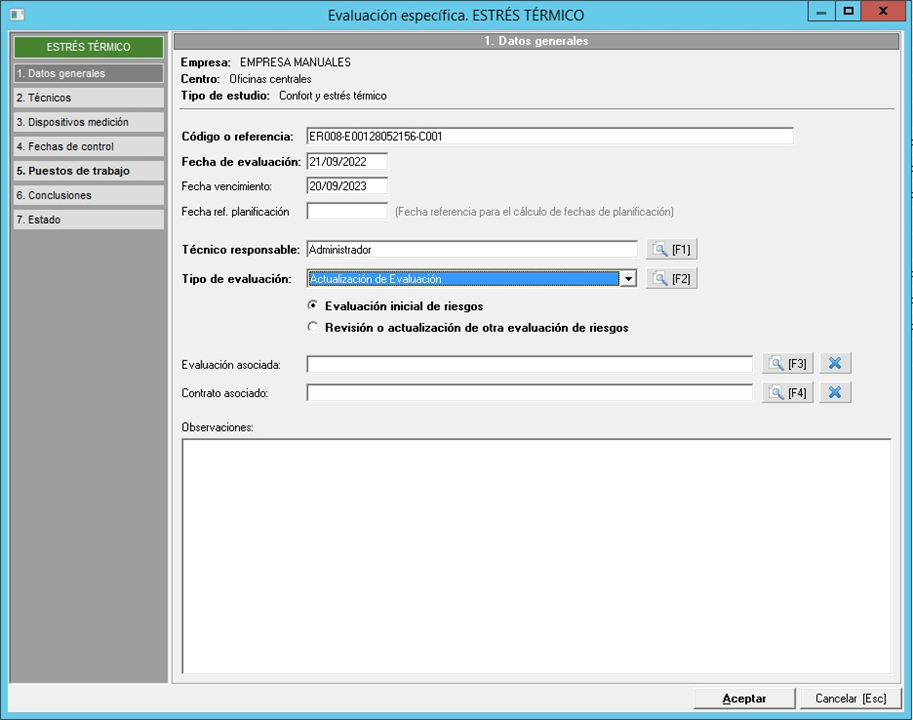 Una vez seleccionado el tipo de evaluación, aparecerá el formulario del estudio de estrés térmico. Para grabar el estudio, será necesario cumplimentar los datos obligatorios que aparecen en el apartado '1. Datos generales', estos datos son los que aparecen en negrita (código, fecha de evaluación, técnico responsable y tipo de evaluación).