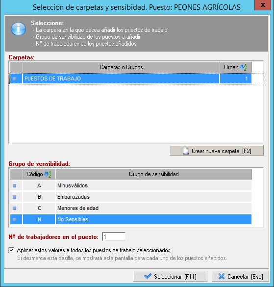 - Añadir puestos de trabajo desde el mantenimiento. Esta opción le da acceso al mantenimiento general de puestos de trabajo para que añada al estudio los puestos que desee evaluar. Estará siempre habilitada. Al añadir los puestos de trabajo desde esta opción, se le solicitará que elija la carpeta en la que quiere ubicarlos dentro del estudio. Si no existe ninguna carpeta, deberá crear una nueva pulsando el botón 'Crear nueva carpeta'. También tendrá que indicar el grupo de sensibilidad y el número de trabajadores que hay en ese puesto de trabajo.