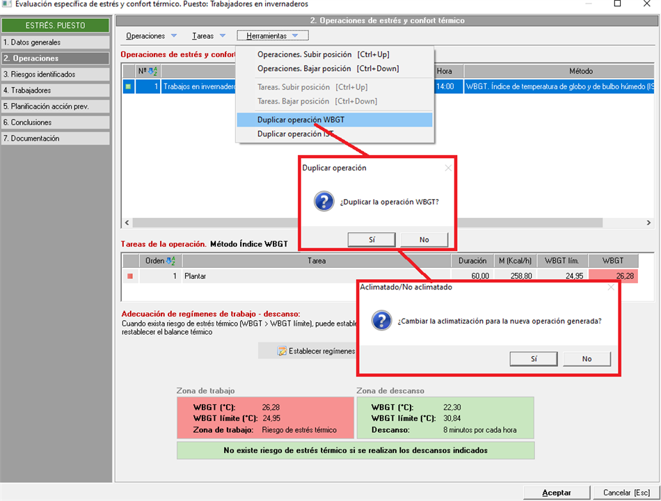 Con todo, si para la misma situación el usuario tiene que evaluar tanto a los aclimatados como a los no aclimatados, se utilizará la Herramienta "Duplicar operación WBT" disponible en el desplegable superior "Herramientas". De esta manera, se conservarán todos los datos de la operación original pero se cambiará el dato sobre la aclimatación y con ello su valoración, añadiéndose al nombre de la operacion " (1)" en el caso de que sea una primera duplicación, aunque este nombre lo podrá modificar.