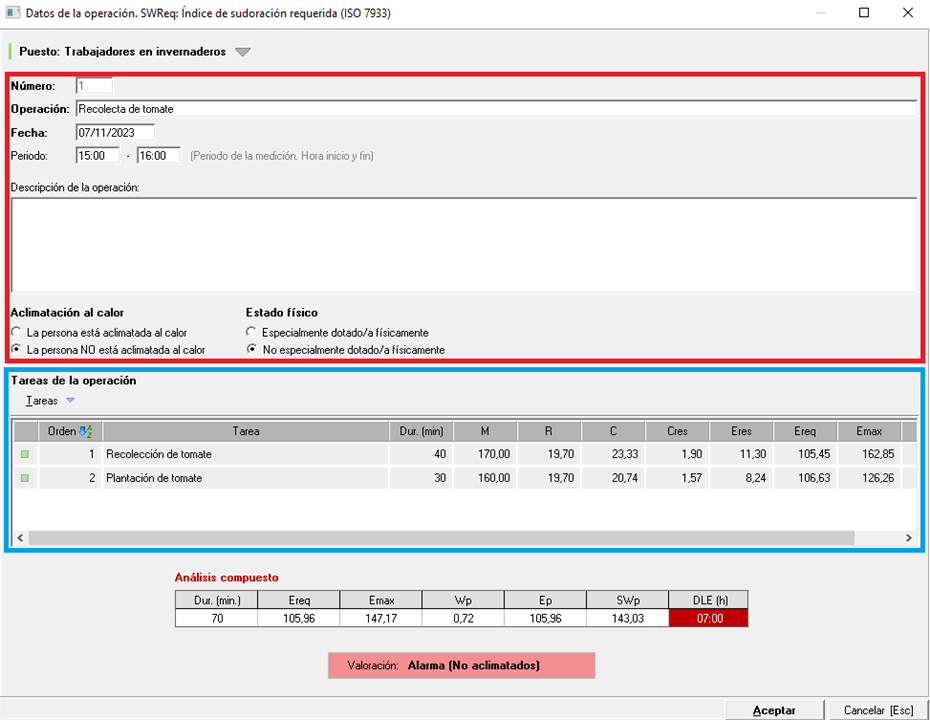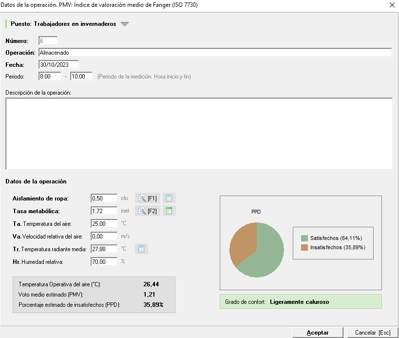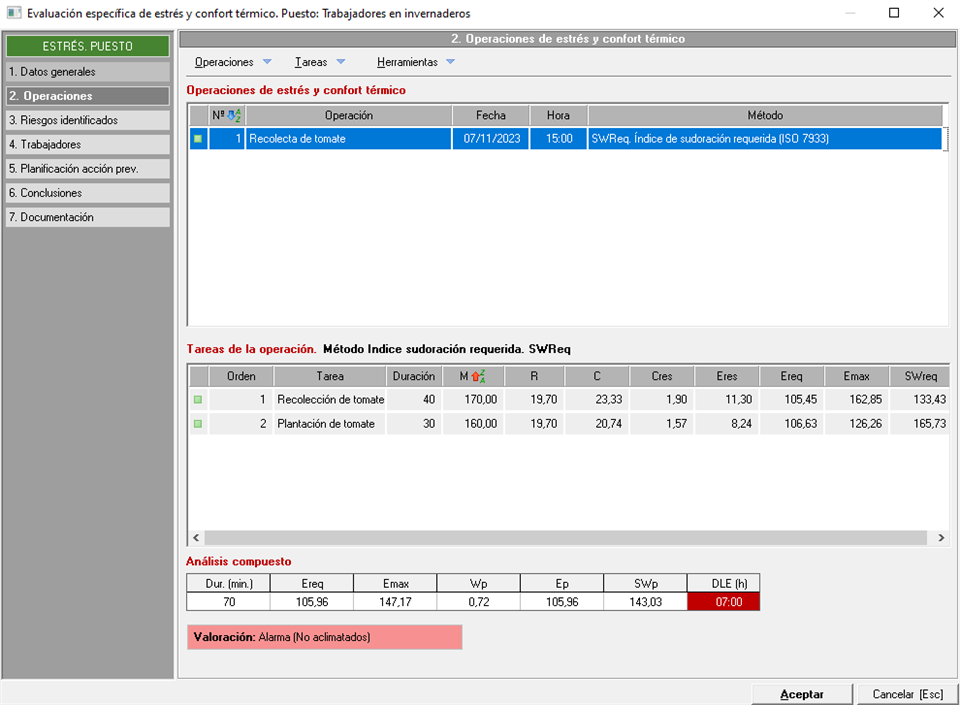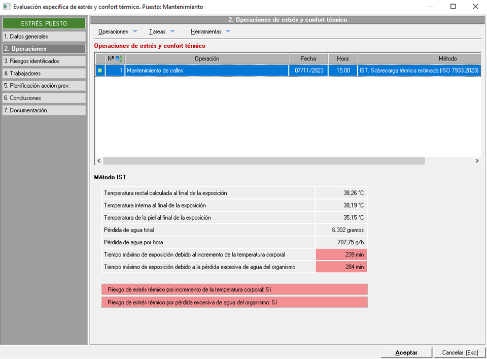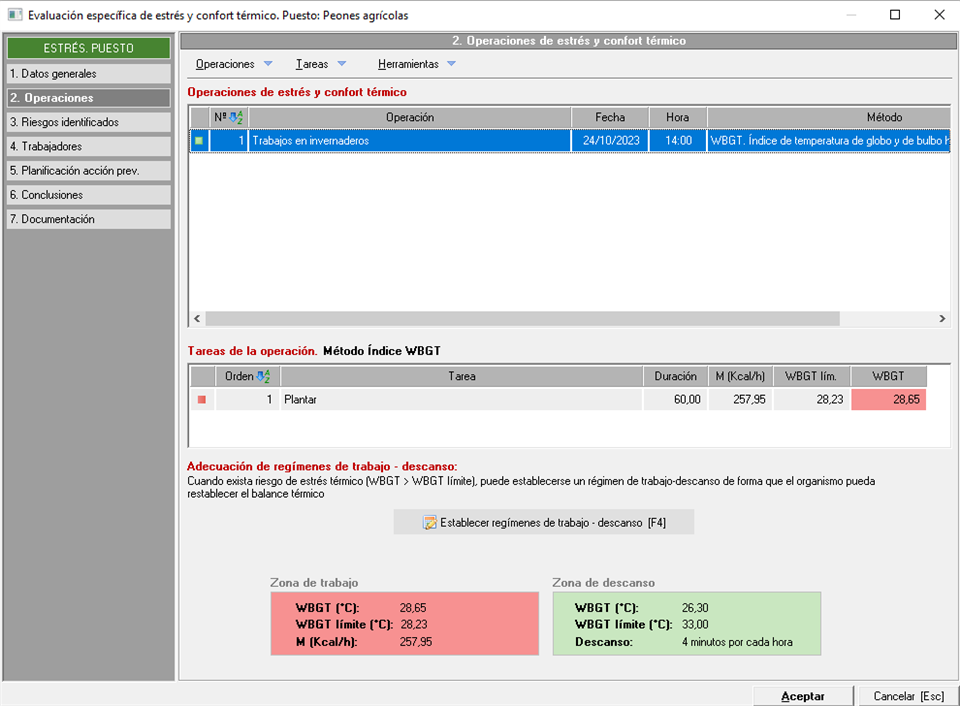 Este apartado es el más importante del estudio, ya que en él se van a reflejar las operaciones en las que se va a valorar la exposición a situaciones de estrés térmico en el puesto de trabajo. Al acceder a este punto, verán las operaciones evaluadas, y en la parte inferior la valoración de la operación seleccionada. Existen varios métodos para evaluar las operaciones, por lo que se va a exponer ahora cada uno de ellos.