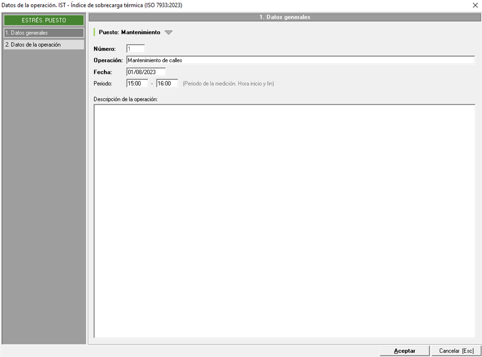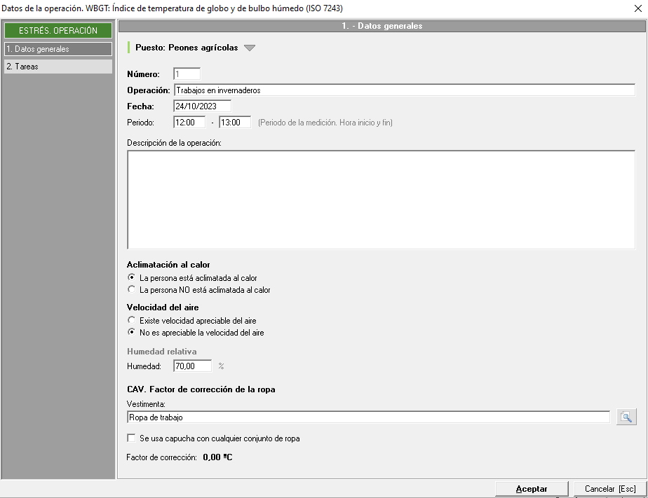 - Datos de la operación. En el caso de este método, después de cumplimentar los datos generales hay que pasar a la segunda pestaña '2. Datos de la operación'. Aquí deberá introducir los datos que calcularán el resultado del estudio, que están divididos en datos de la persona, del ambiente, de la ropa de trabajo y de la actividad.