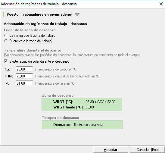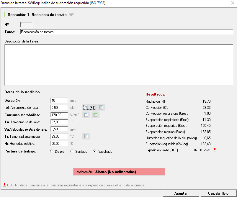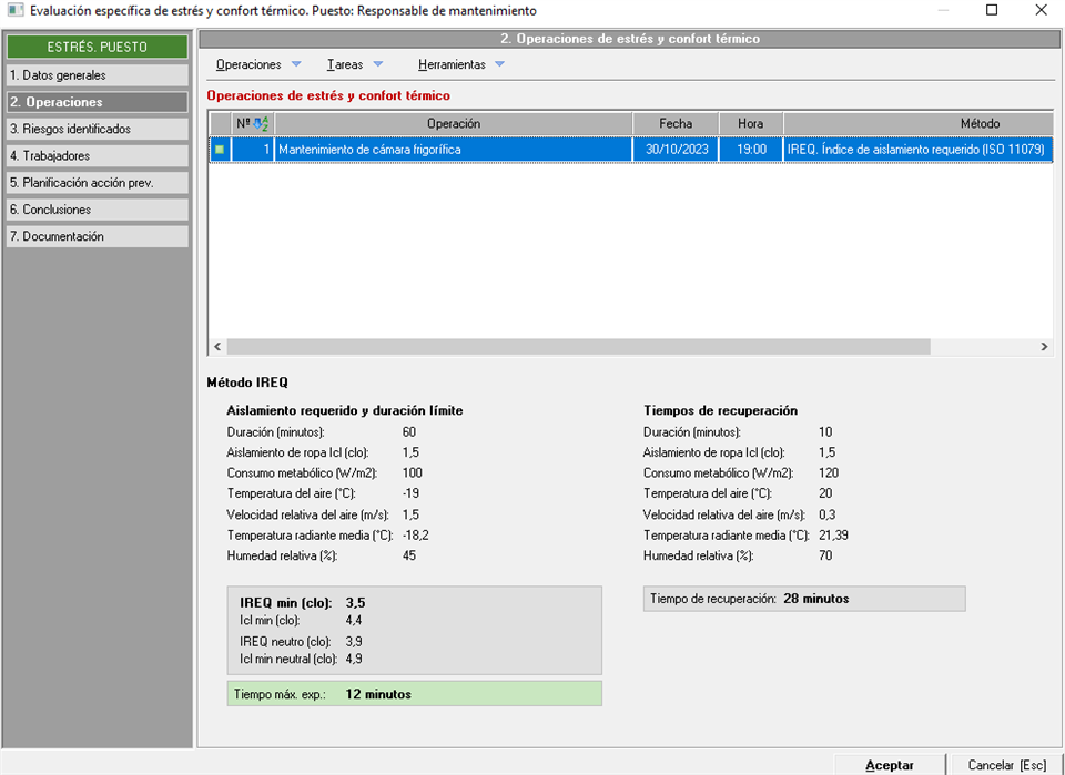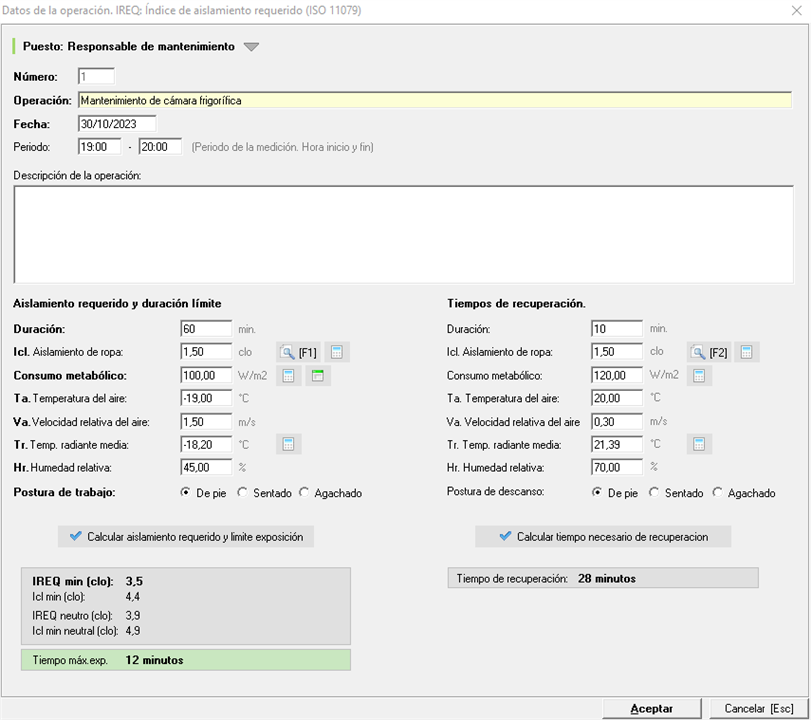 - Aislamiento requerido y duración límite. Se especificarán los datos o se calcularán algunos de ellos, como el aislamiento de la ropa, el consumo metabólica o la temperatura radiante media.