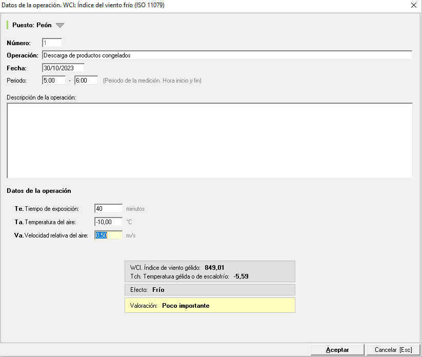 Desde el listado de operaciones de la evaluación puede crear nuevas operaciones de estrés térmico desde el desplegable 'Operaciones' y pulsando sobre la opción 'Nueva operación'. En ese momento deberán elegir el método WCI. Índice del viento frío (ISO 11079).