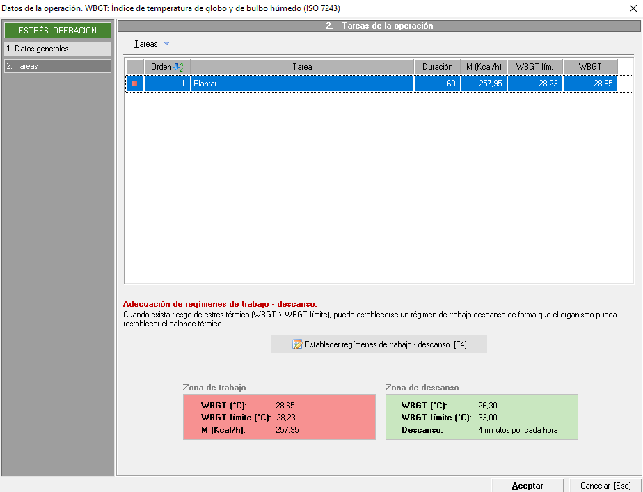 Para este método en concreto, podrá establecer los regímenes de descanso para cuando se supere el WBGT límite una vez introducidas todas las tareas a registrar. Para ello, en el listado de taraes pulse sobre el botón