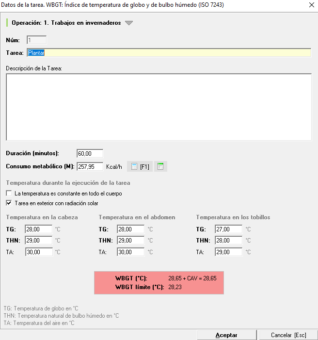 para obtener el resultado deseado. Además, según si la temperatura es constante en todo el cuerpo o no, deberá introducir los datos de las diferentes zonas corporales (cabeza, abdomen y tobillos), siendo posible indicar la temperatura del aire en tareas con radiación solar.
