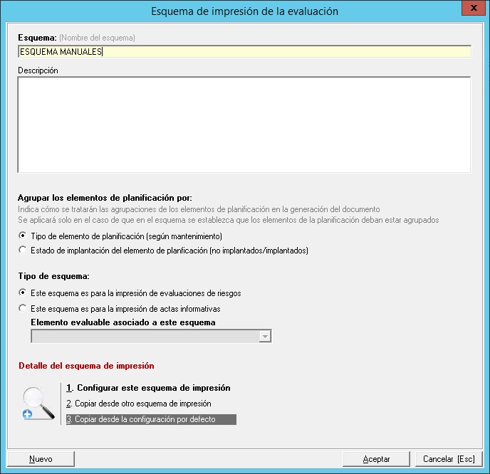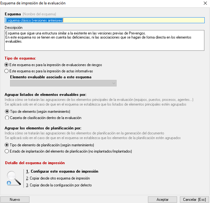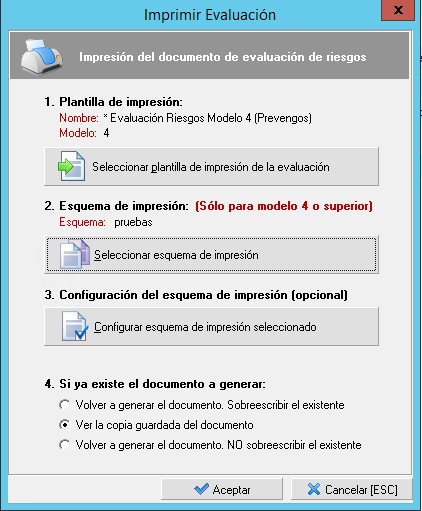 Al enviar a imprimir una evaluación de riesgos aparecerá una pequeña ventana donde el usuario deberá seleccionar la plantilla y el esquema de impresión que quiere utilizar.