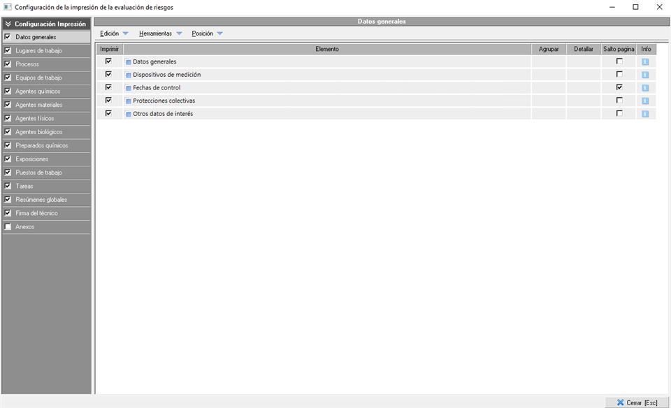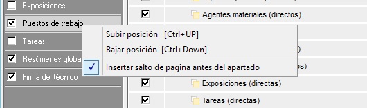 Centrándonos en la parte de la izquierda, el usuario podrá activar los apartados que quiera imprimir o desactivar aquellos que no quiera incluir en el informe. Además, seleccionando un apartado y pulsando con el botón derecho del ratón sobre el mismo, el usuario tendrá la opción de 'subir' o 'bajar' posición, para cambiar el orden en el que se imprimirán esos apartados, y también podrá indicar que quiere insertar un 'salto de página' en el documento, previo a la impresión de este apartado, para que ese apartado empiece a imprimirse en una hoja nueva.