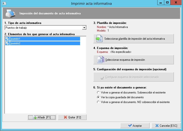 Al enviar a imprimir un acta informativa de una evaluación de riesgos, aparecerá una pequeña ventana donde el usuario deberá seleccionar el elemento para que quiere imprimir el acta informativa, la plantilla y el esquema de impresión que quiere utilizar.