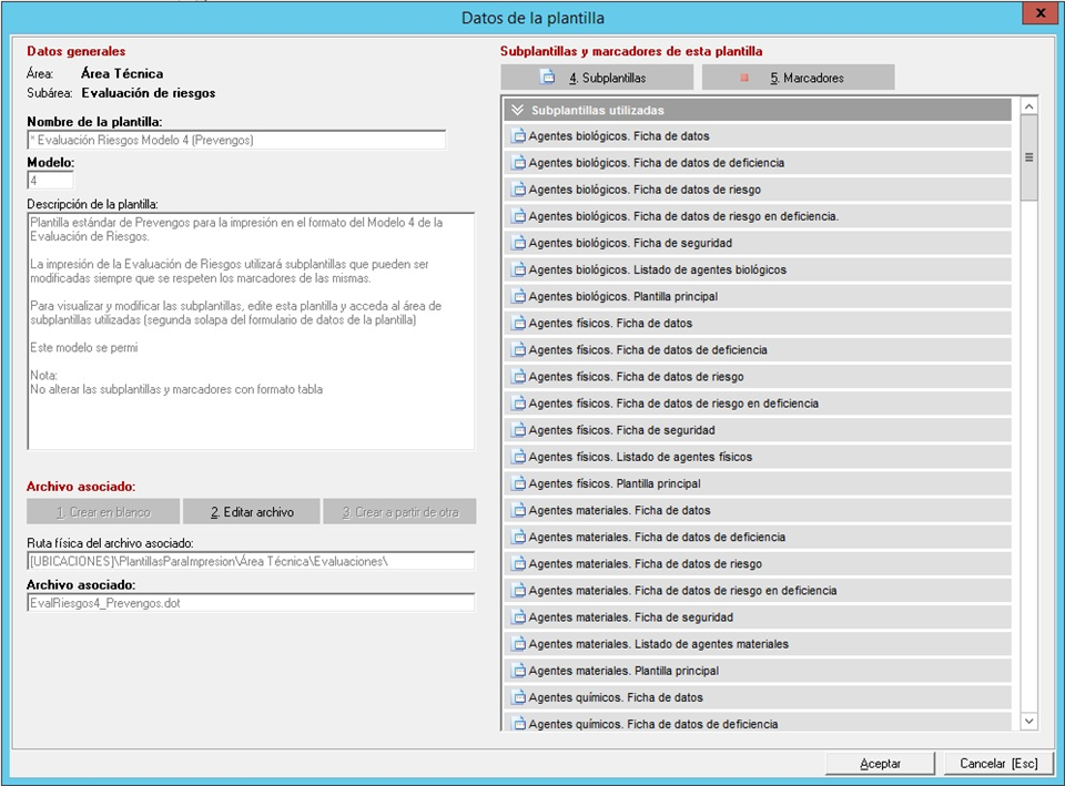 En el caso de la evaluación de riesgos, la plantilla de impresión no es un único documento de Word, esta plantilla está hecha 'trozos'. Cada 'trozo' será un documento de Word independiente, a los que llamamos 'subplantillas', y cada 'subplantilla' es una parte del documento final. Por ejemplo, la parte de los datos generales de la evaluación se encuentra en una subplantilla, mientras que la ficha de datos de los puestos de trabajo evaluados está en otra subplantilla.