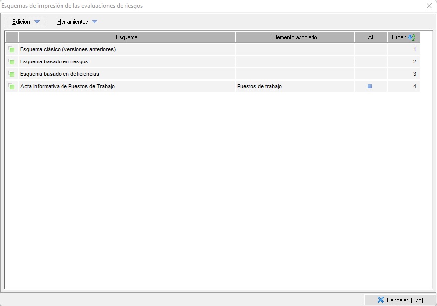 En esta pantalla el usuario podrá encontrar algunos esquemas de impresión predefinidos por la aplicación. Estos esquemas pueden modificarse, o incluso el usuario puede crear sus propios esquemas de impresión. En este formulario, se encuentran los esquemas de impresión para imprimir el informe completo de la evaluación y los esquemas para imprimir 'actas informativas'. El usuario podrá diferenciarlos por el icono que aparece en la columna 'AI'.