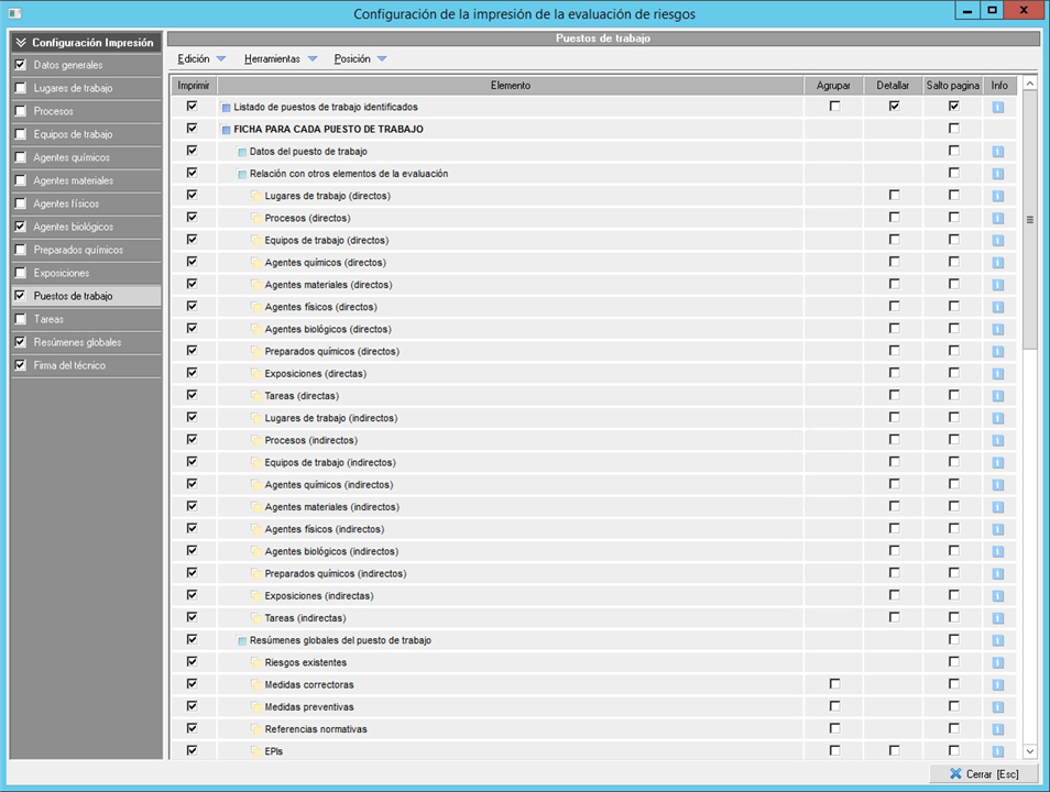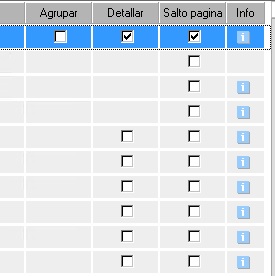 - En algunos elementos, pueden habilitarse las opciones que ven en las columnas de la derecha, donde el usuario puede indicar si quiere ese apartado en formato 'detallado', 'agrupado', o incluso añadir un salto de página antes de ese apartado. Normalmente las opciones de 'agrupado' y 'detallado' están sólo disponibles para los listados.