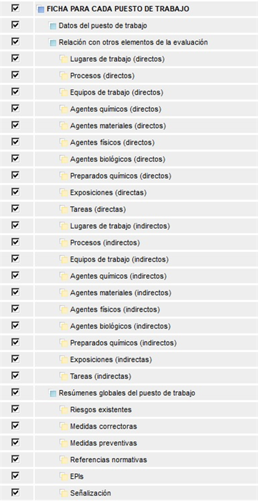 - Como puede observar, existen varios niveles. La tabulación y el cambio de color, indica que unos datos están dentro de otros. Por ejemplo, si se fijan en la siguiente imagen correspondiente al apartado de puestos de trabajo, la opción 'FICHA PARA CADA PUESTO DE TRABAJO' tiene por debajo las opciones 'Datos del puesto', 'Relación con otros elementos de la evaluación', 'Resúmenes globales del puesto de trabajo', etc. Estos apartados corresponden a los datos que se imprimirán dentro de la ficha de datos del puesto.