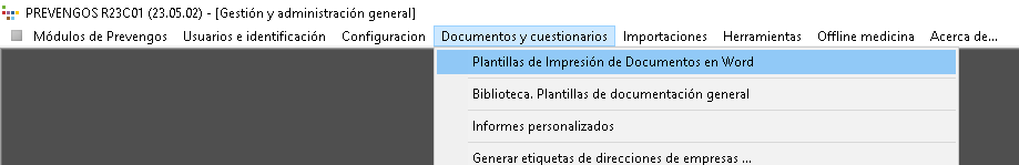 Para modificar las plantillas desde la pantalla de plantillas de impresión de Prevengos, debe situarse en la pantalla principal de Prevengos y desplegar el menú 'Documentos y cuestionarios' y pulsar sobre la opción 'Plantillas de impresión de documentos de Word'.