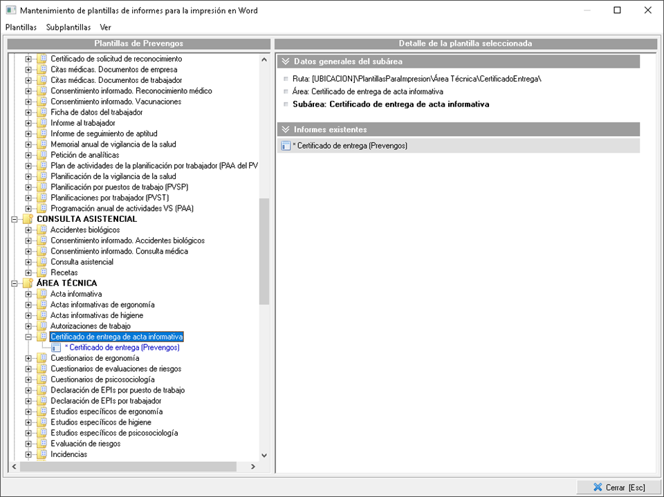 NOTA: deben tener en cuenta que, para crear plantillas nuevas, deben hacerlo utilizando las opciones antes indicadas, para que Prevengos cree la estructura de subplantillas y marcadores correspondientes a ese documento. NO se puede utilizar cualquier documento como plantilla de impresión.