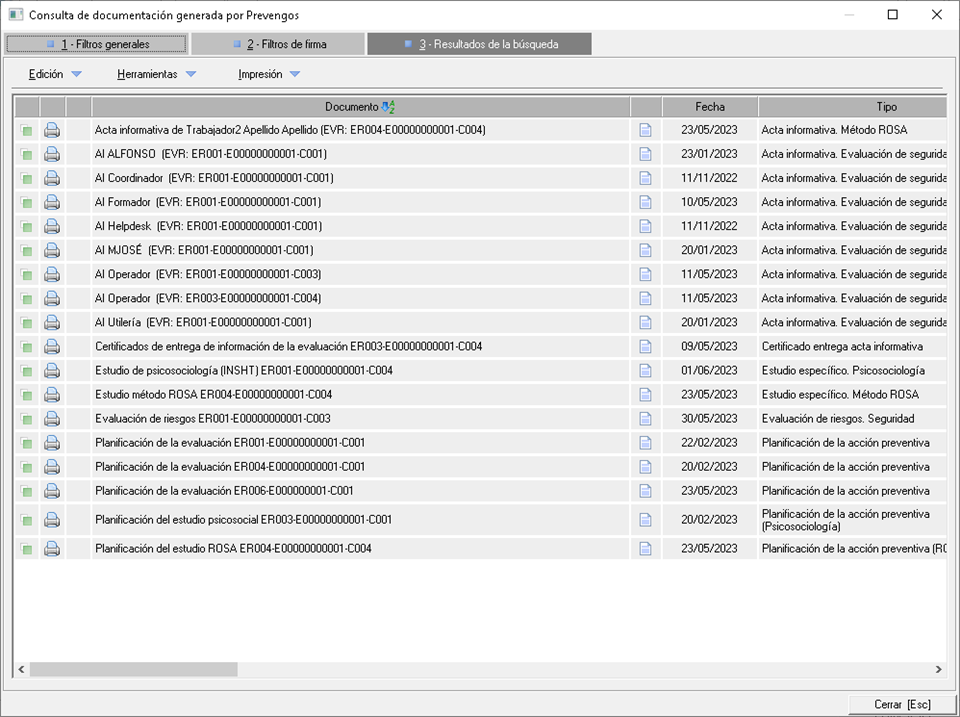 Devuelve un listado, mediante la consulta Consulta de documentos generados por Prevengos, con todos los documentos generados de EVR para la empresa y sus centros