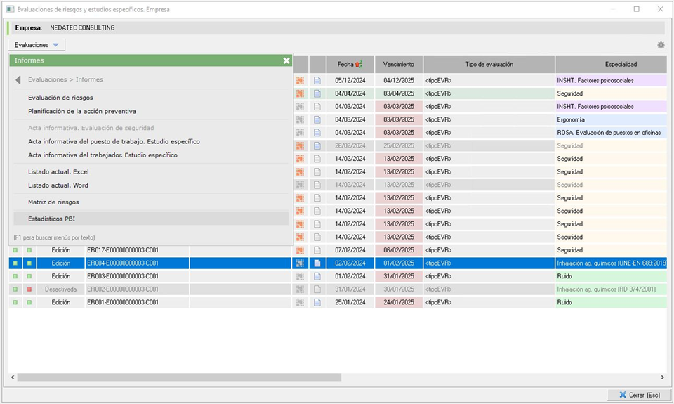 - Desde la consulta de evaluaciones de riesgo, en la pestaña de 'Evaluaciones' con la opción 'Informes'>'Acta informativa'.