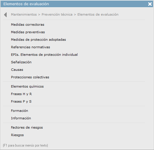 En este manual vamos a ver los diferentes mantenimientos que tenemos disponibles en el área técnica y que podremos usar también en otros módulos de Prevengos. En concreto nos vamos a centrar en los mantenimientos que vemos en la siguiente imagen, a los que se accede desde el menú Mantenimientos > Prevención técnica > Elementos de evaluación: