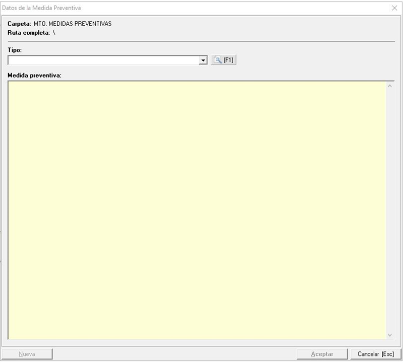 Este mantenimiento es exactamente igual que el de medidas correctoras explicado en el apartado anterior. Cuando creamos una medida preventiva nueva, los campos obligatorios son el propio texto de la medida correctora y el campo Tipo, tal y como vemos en la siguiente imagen: