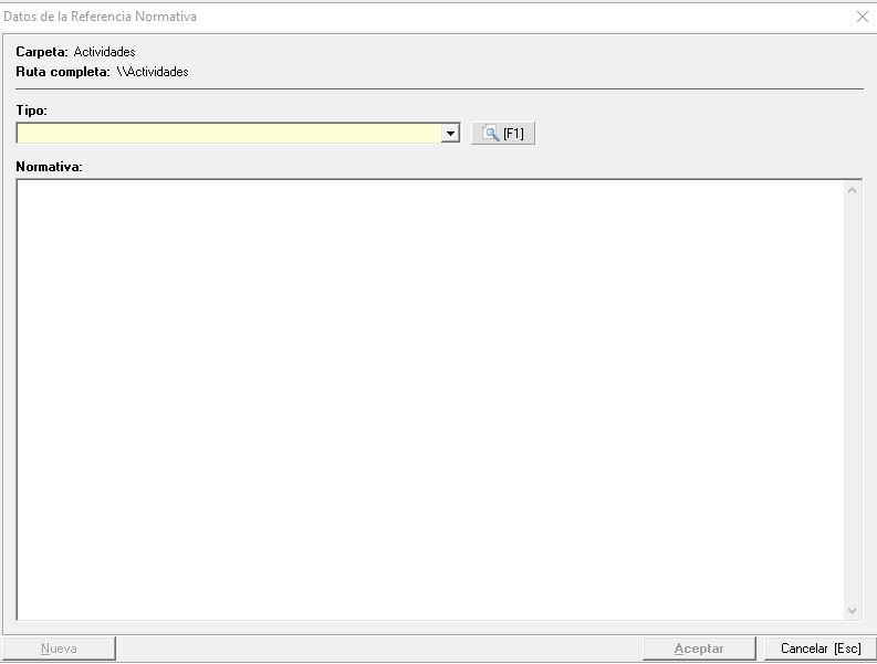 Este mantenimiento tiene también muchas similitudes con respecto a lo que hemos visto en los apartados anteriores. Cuando creamos una referencia normativa , los campos obligatorios son el propio texto de la propia normativa y el campo Tipo, tal y como vemos en la siguiente imagen: