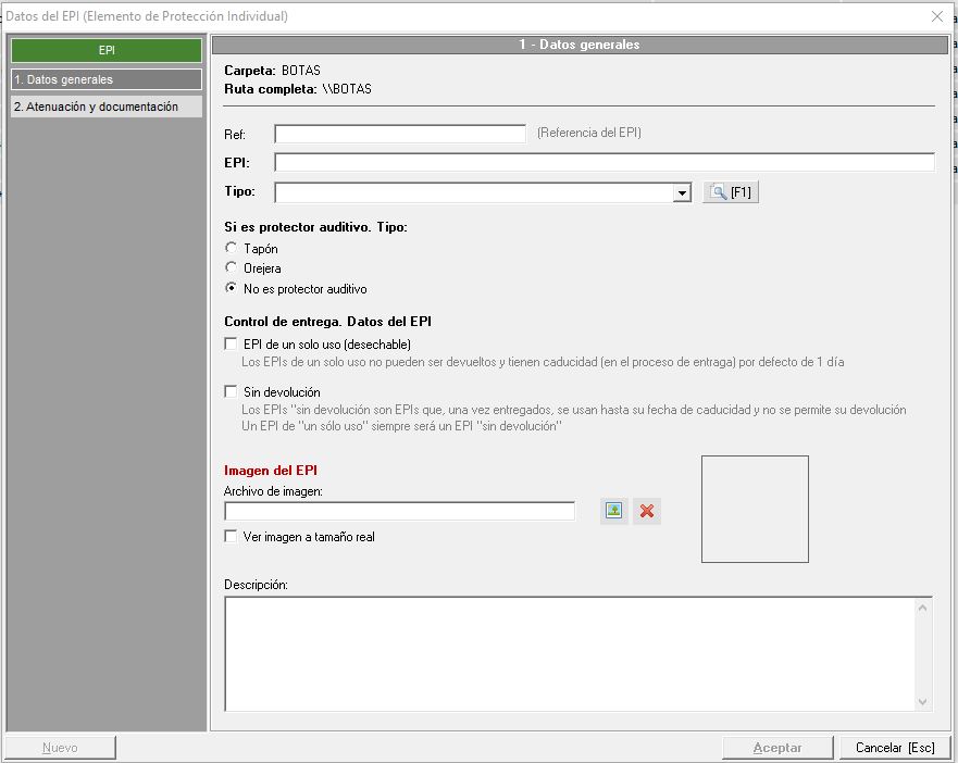 Los elementos de protección individual (EPI) son algo diferentes en su creación a lo que hemos visto en los apartados anteriores, ya que pueden recoger más información sobre el propio EPI. No obstante, habrá elementos comunes tal y como explicamos en el punto 2 de este manual. A la hora de crear un nuevo EPI, la ventana que se muestra es similar a la siguiente imagen: