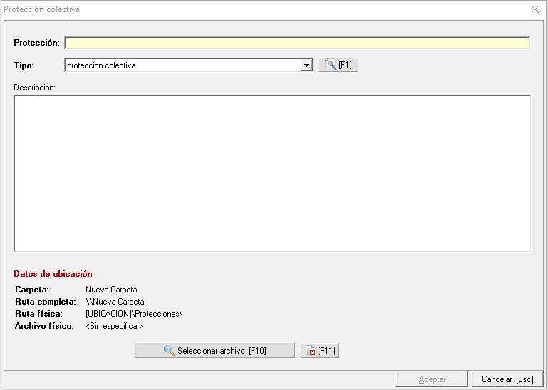 Dentro de este mantenimiento podemos tener aquellas protecciones colectivas que queramos después utilizar, por ejemplo, en una evaluación de riesgos. A diferencia de otros mantenimientos, estas protecciones colectivas pueden llevar asociado un documento que se guarda de manera automática en la carpeta de documentación de Prevengos. La ventana con la que creamos una nueva protección colectiva es similar a la siguiente: