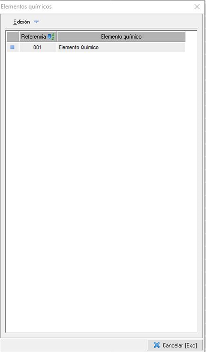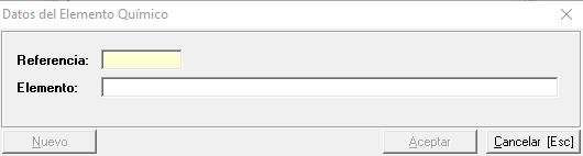 En esta ventana debemos indicar una referencia y el nombre del elemento, teniendo en cuenta que lo que pongamos en el campo Referencia no puede estar ya existente en otro elemento, no se puede repetir. El campo Elemento nos servirá para indicar el nombre del elemento químico que estamos creando.