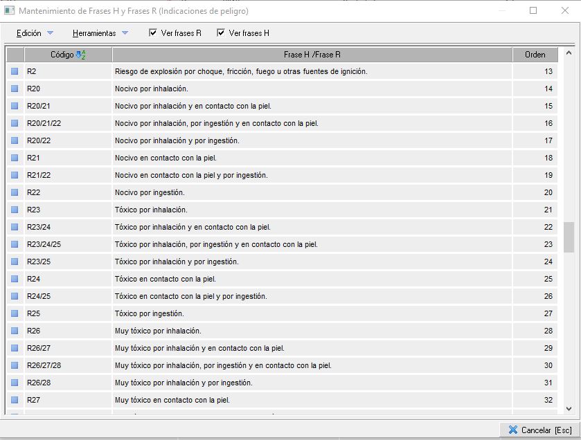 Desde el desplegable Herramientas tenemos las opciones disponibles con las que podemos subir y bajar de posición las frases dentro del mantenimiento, de tal manera que lo que realmente estamos haciendo es variar el numero de la columna Orden. No obstante, también podemos ordenar alfabéticamente las columnas Código y Frase H/ Frase R