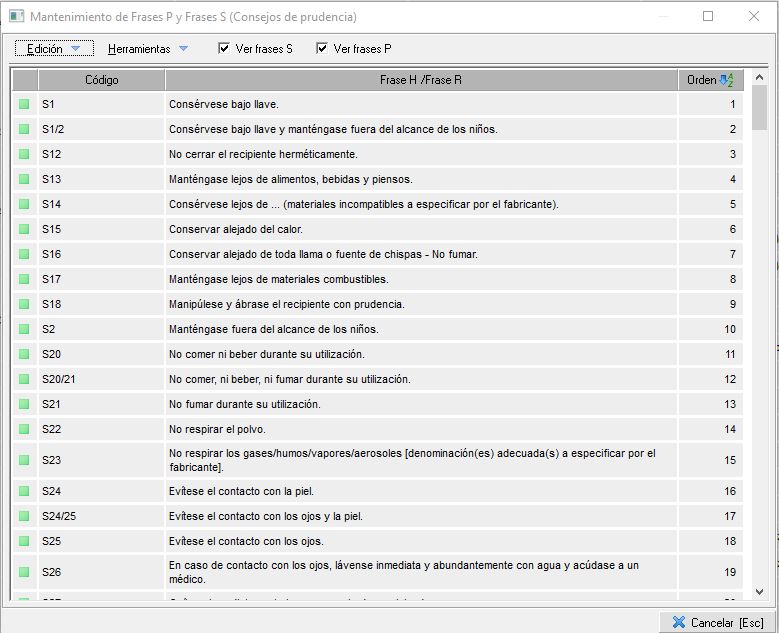 Desde el desplegable Herramientas tenemos las opciones disponibles con las que podemos subir y bajar de posición las frases dentro del mantenimiento, de tal manera que lo que realmente estamos haciendo es variar el numero de la columna Orden. No obstante, también podemos ordenar alfabéticamente las columnas Código y Frase S/ Frase P.