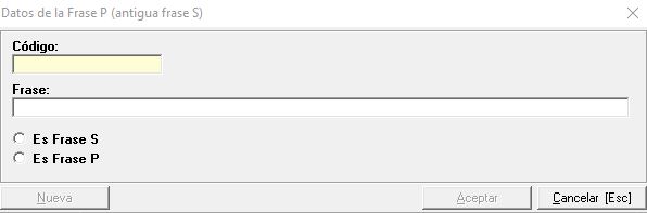 Dentro de esta ventana estableceremos el Código que queremos que tenga la frase (el cual no se puede repetir si ya existe en otra frase), así como el texto indicativo de la propia Frase. posteriormente deberemos indicar, obligatoriamente, si la frase es del tipo S o del tipo P.