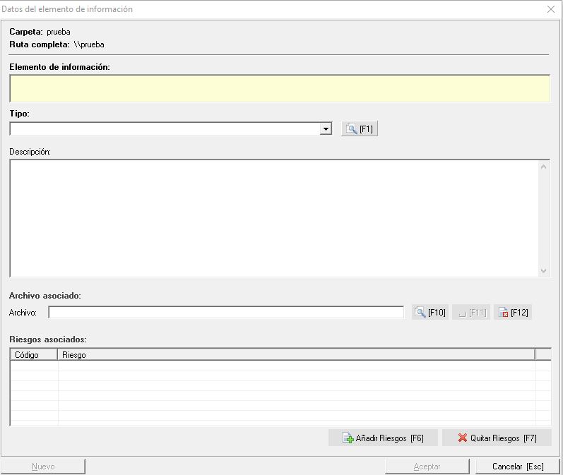 Mantenimiento muy similar tanto en estructura como en opciones, a los que vimos anteriormente, en este caso gestionaremos los elementos de información que podemos añadir en una evaluación de riesgos, por ejemplo. La ventana que se nos muestra en el momento de crear un elemento nuevo es similar a la siguiente imagen: