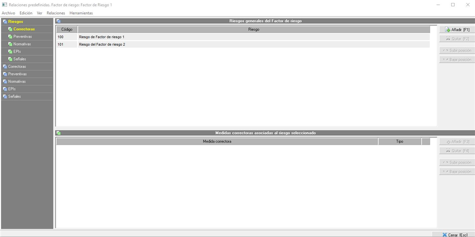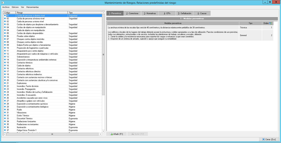 No tenemos carpetas con el que clasificar los elementos, pero si tenemos un listado completo de los riesgos existentes en la parte izquierda del propio mantenimiento. La parte derecha, donde encontramos los botones de Preventivas, Correctoras, Normativas, EPIs, Señalización y Causas son las relaciones predefinidas del riesgo que tengamos seleccionado en la izquierda. Tal y como explicamos en el apartado anterior de Factores de riesgos, podemos establecer una serie de elementos con el fin de que cuando añadimos un riesgo en una Evaluación de riesgos, por ejemplo, se inserten de manera automática los elementos que tenga establecidos, como podría ser una medida preventiva, una correctora, un EPI, etc. Para añadir estas relaciones simplemente seleccionaremos el riesgo y el elemento que queremos añadir (correctora, preventiva,...) y hacer clic sobre el botón inferior "Añadir" o usar la herramienta "Añadir ....." que encontramos en el menú superior Archivo.