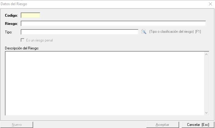 Dentro de este mismo menú superior Archivo disponemos de las opciones necesarias para crear/editar/eliminar elementos. En el caso de crear un riesgo nuevo nos aparecerá una ventana similar a la siguiente imagen:
