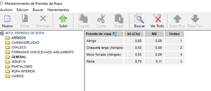 - ‘Archivo’: con esta opción se podrá crear una nueva carpeta o prenda de ropa, cambiar el nombre de la carpeta seleccionada, editar la prenda de ropa seleccionada o eliminar la carpeta o prenda de ropa seleccionada si no se ha utilizado en Prevengos. Para crear una nueva prenda se deberá indicar el nombre de la prenda así como el índice de aislamiento térmico de la prenda. Se calculará automáticamente el coeficiente de transferencia térmica (m2oC/W).