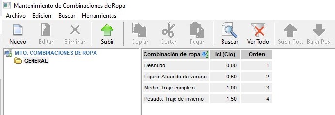 Como se puede apreciar en la imagen, dispone de los mismos menús desplegables en las barras superiores que se han comentado en el punto anterior. Para crear una nueva combinación de ropa se deberá indicar, como en el caso de la ropa, el nombre de la combinación de ropa y el índice de aislamiento de la combinación de ropa.