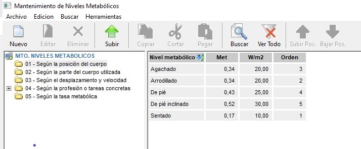 El mantenimiento de los niveles metabólicos tiene el mismo aspecto visual que los vistos anteriormente, organizado en carpetas y subcarpetas. En cuanto a las funcionalidades (dispone de los mismos menús) son muy similares salvando algunos aspectos específicos.
