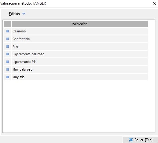 Este mantenimiento funciona exactamente igual que el visto en el apartado anterior con las especificaciones del método WCI. En él están definidas las distintas valoraciones del efecto frío indicadas en el método. El usuario podrá cambiar la definición de estas valoraciones, pero no podrá crear valores nuevos ni eliminar los existentes.