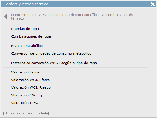 En concreto, los mantenimientos de estudios específicos de estrés térmico se encuentran en el menú Mantenimientos > Evaluaciones de riesgo específicas > Confort y estrés térmico.