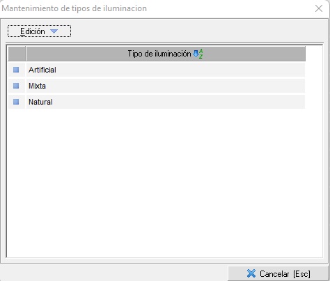 Una vez dentro del mantenimiento, desde el menú desplegable 'Edición' el usuario podrá crear, modificar o eliminar los tipos de iluminación según sus necesidades.