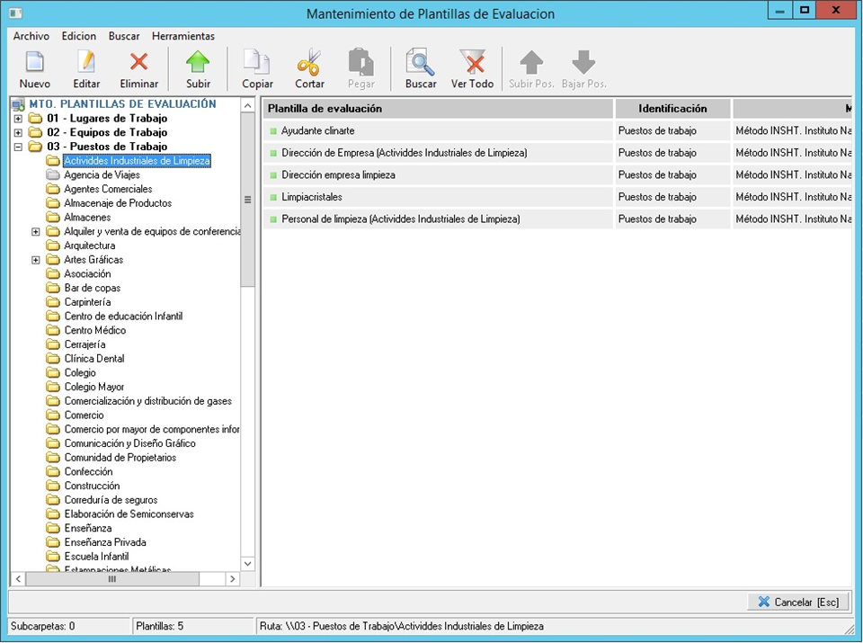 Como podrán observar, la pantalla del mantenimiento es idéntica a la de cualquier otro mantenimiento de carpetas en Prevengos. Desde el botón 'Nuevo' que hay en la parte superior izquierda de la pantalla, el usuario podrá crear carpetas en distintos niveles para clasificar de la mejor manera posible las plantillas que almacenará en esta pantalla. Es necesario crear carpetas para poder crear plantillas.