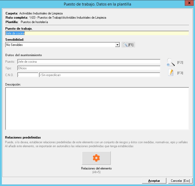 Si hace doble clic sobre el elemento, abrirá primero la ficha de datos generales del mismo, donde podrá editar datos básicos, por ejemplo, en el caso del puesto de trabajo, puede personalizar el nombre, el grupo de sensibilidad que se va a tener en cuenta en la evaluación, la descripción, etc...