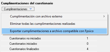 Realizadas las cumplimentaciones, y la carga de las mismas en Prevengos como se explica a continuación, podrá generar un fichero compatible con la aplicación FPSICO que facilita el INSST. Tras realizar la carga de las cumplimentacion deberá usar el desplgable cuestionarios situado en el resumen del total de cumplimentaciones para generar el fichero.