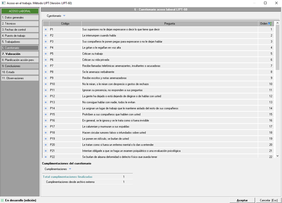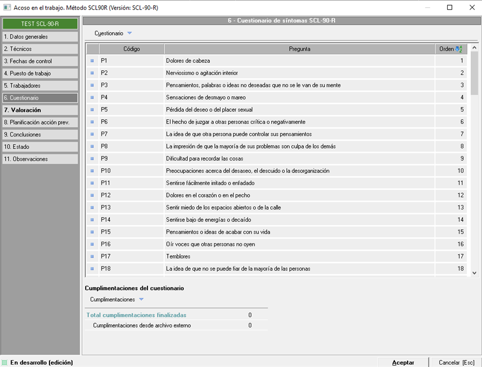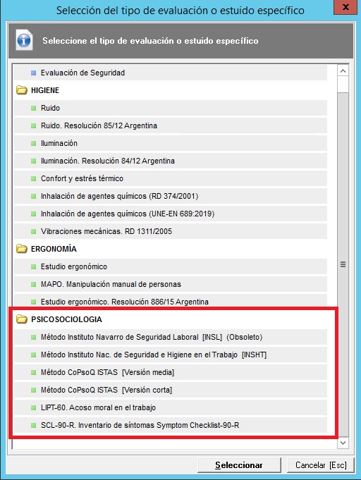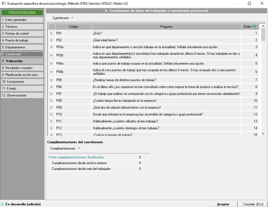 A continuación se van a exponer los diferentes cuestionarios que se pueden importar dependiendo del método de evaluación psicosocial elegido.