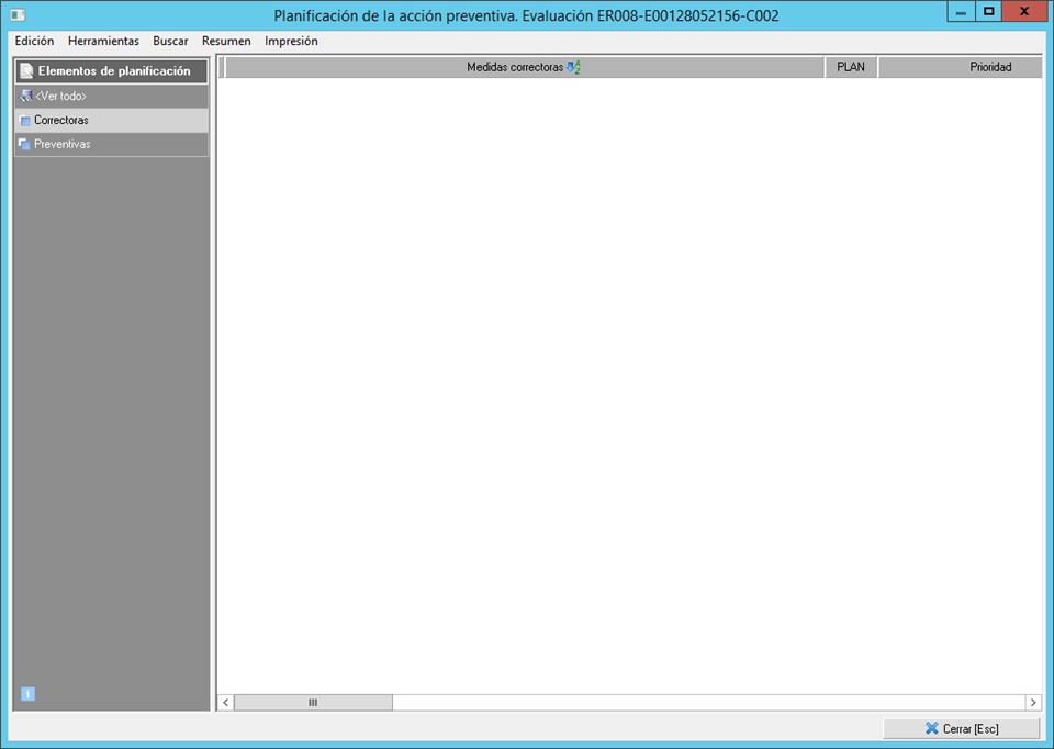 Al acceder a la pantalla de planificación, en la parte izquierda de la pantalla podrá visualizar las opciones 'Correctoras' y 'Preventivas', para añadir medidas, deberá seleccionar el apartado al que quiere añadir datos, y con el menú desplegable 'Edición' tendrá la opción de añadir elementos, que le llevará a los mantenimientos correspondientes para seleccionar los elementos a planificar.
