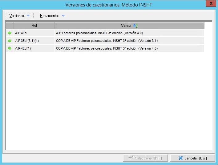 Una vez seleccionado el método que se desea utilizar, aparecerá la pantalla del mantenimiento de versiones del cuestionario disponibles para ese método, donde el usuario tendrá que seleccionar la versión que desea utilizar.