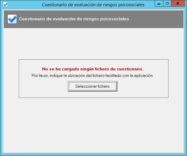 Una vez generado el fichero, debe situar la aplicación 'CuestinarioPS' y el fichero en el mismo ordenador y ejecutar la aplicación. Al ejecutar la aplicación por primera vez, le aparecerá una pantalla indicando que seleccione el fichero que quiere utilizar.