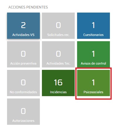 Cuando el trabajador acceda al portal web del empleado, le aparecerá una pantalla inicial con un resumen de 'acciones pendientes', entre las que observará un cuadro verde con el nombre 'Psicosociales' y el número de cuestionarios que debe cumplimentar.
