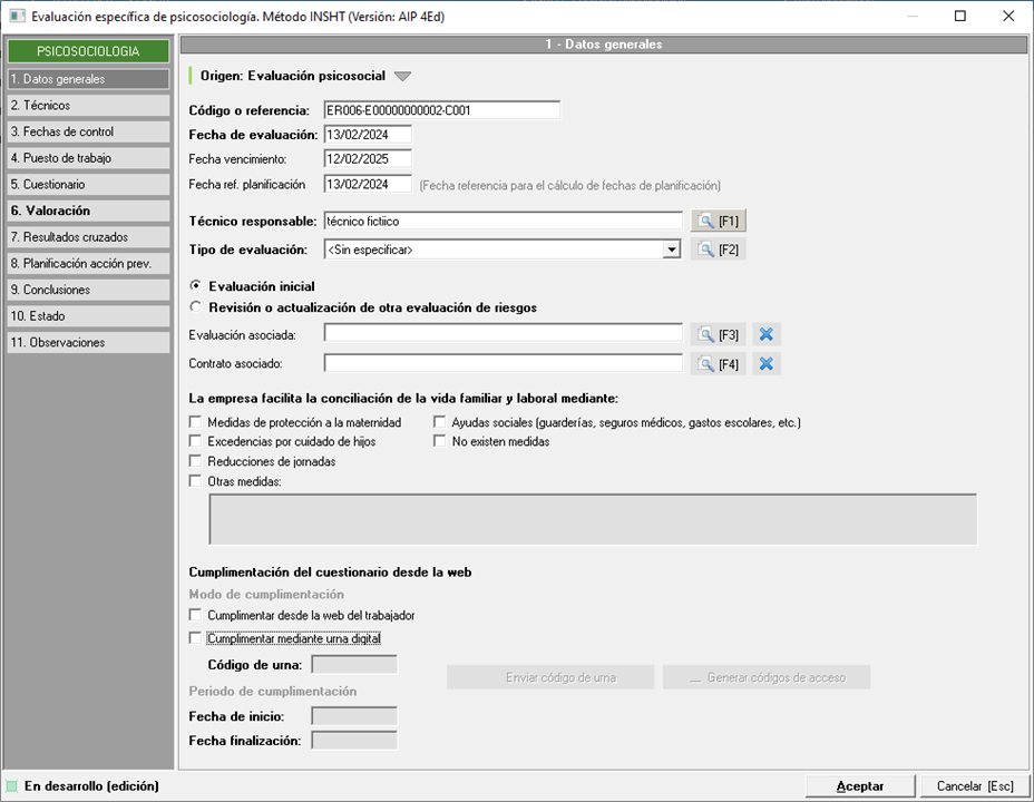Una vez indicada la versión del método que se desea utilizar, se abrirá el formulario de la evaluación, y para poder grabar la evaluación será necesario cumplimentar los datos marcados en negrita del apartado de 'Datos generales'. En cuanto al modo de cumplimentación, podrá ser a través de la aplicación "CuestionarioPS", desde la web del trabajador o utilizando una urna digital. Más adelante se dedicará un apartado para cada uno de los modos de cumplimentación, aunque si se decide sobre los modos web o urna digital, se especificará en la parte inferior de esta pestaña, donde en el caso de la urna se le muestra su código para poder abrirla. La siguiente imagen ejemplifica el caso de un estudio que se cumplimenta mediante una urna digital y se han asignado ya códigos a los trabajadores para que accedan al cuestionario, por lo que ya ha quedado bloqueado el modo de cumplimentación.