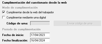 Al igual que en el modo de cumplimentación vía web del empleado, el cuestionario estará disponible según los plazos de cumplimentación establecidos en el apartado "1. Datos generales" de la evaluación. Al elegir este modo de cumplimentación, se generará un código de urna en este mismo apartado que debe custodiar el responsable para abrirla y/o cerrarla.